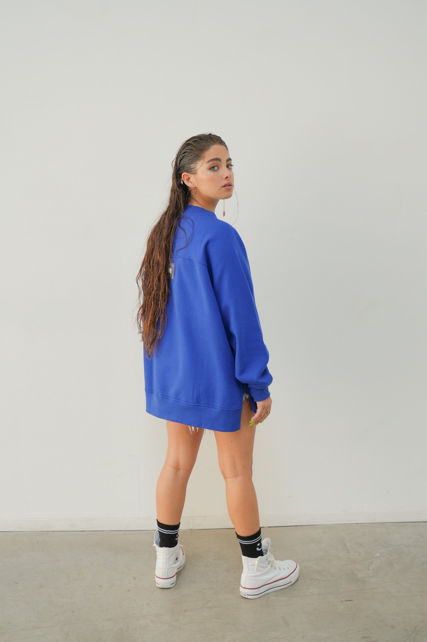 Buzo corte oversize, cuello redondo y manga ranglan, con recortes en los laterales.
